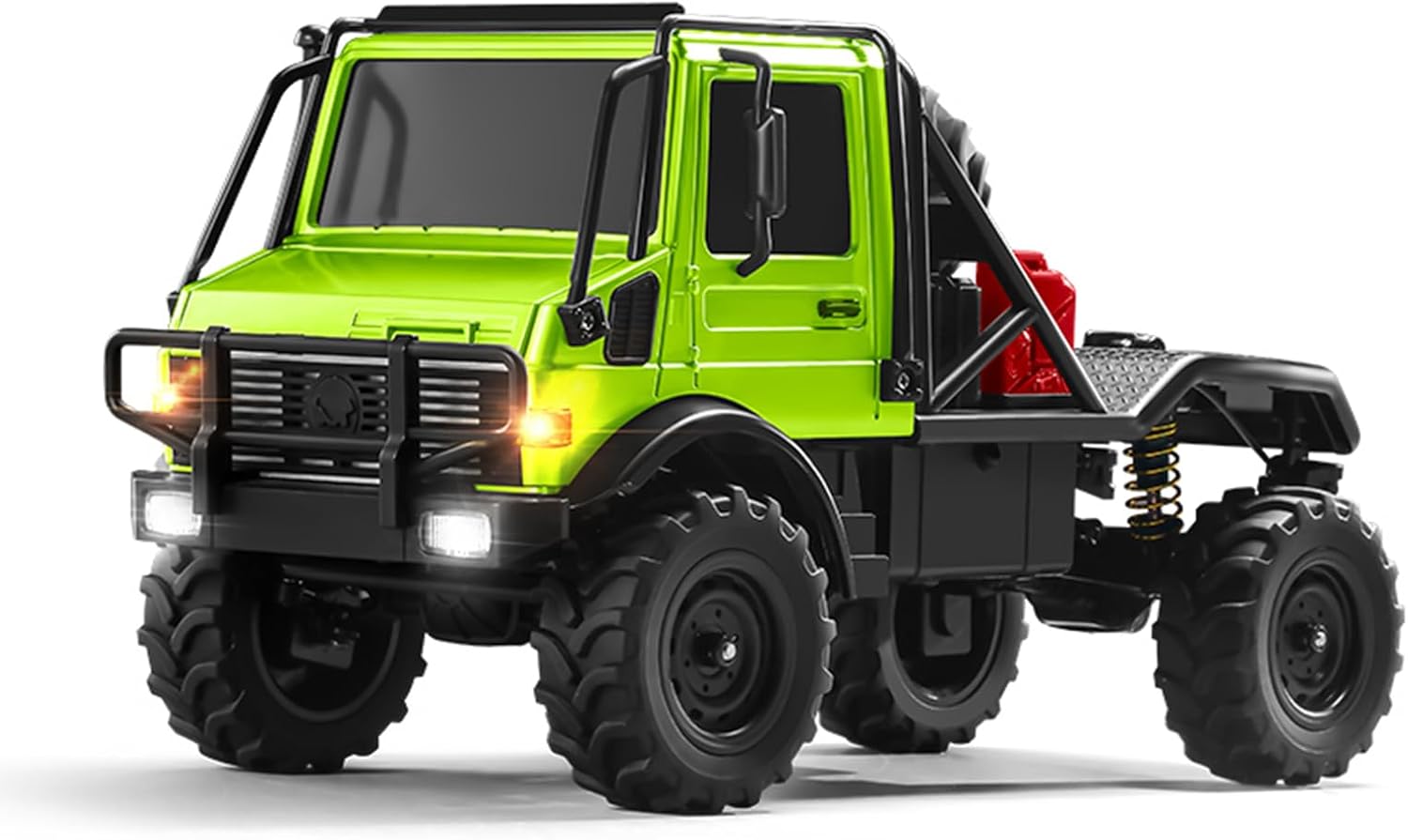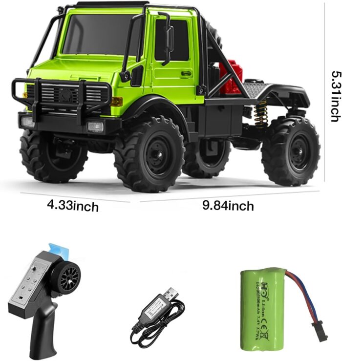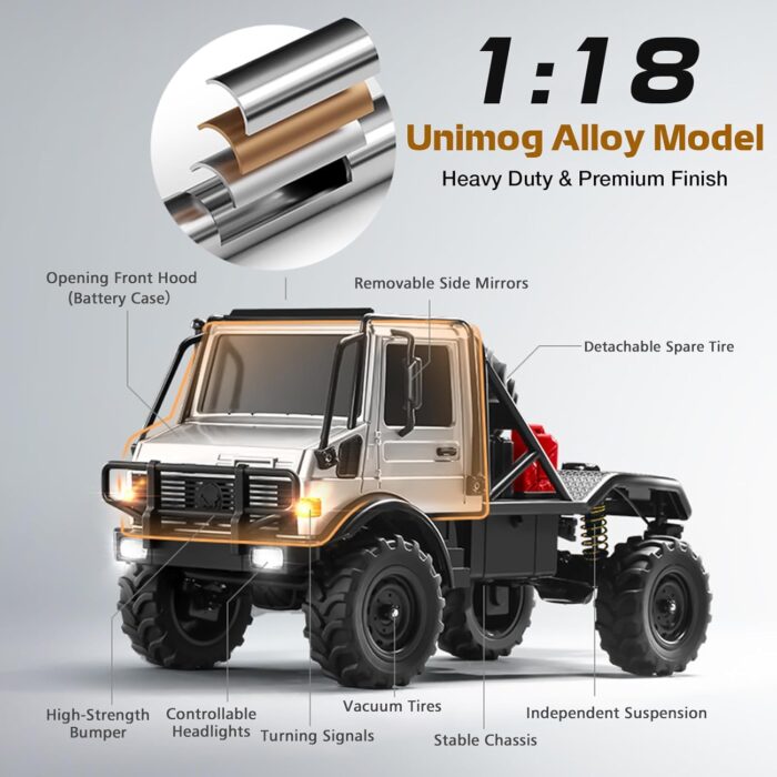 This 1:18 UNIMOG RC crawler features a premium die-cast metal body for a substantial, rugged feel. With its meticulous scale detailing and licensed branding, it’s a true collector’s piece that’s also built to tackle tough terrain.
