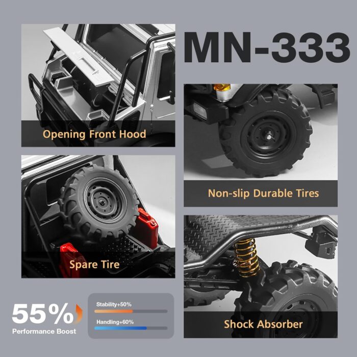 𝐇𝐢𝐠𝐡 𝐏𝐞𝐫𝐟𝐨𝐫𝐦𝐚𝐧𝐜𝐞: Featuring a 4-link suspension and waterproof steering servo, the MN-333 delivers excellent off-road performance and efficient 2-speed power. Its 180 motor and 7.4V 500mAh battery provide strong torque and longer run time, with up to 3kg towing and 2kg payload capacity.