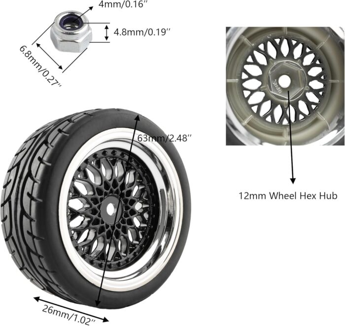 Dimension of Tires: Outer Diameter Approx 2.48”(63mm), Width: Approx 1.02” (26mm), Drive Hubs:12mm Hex