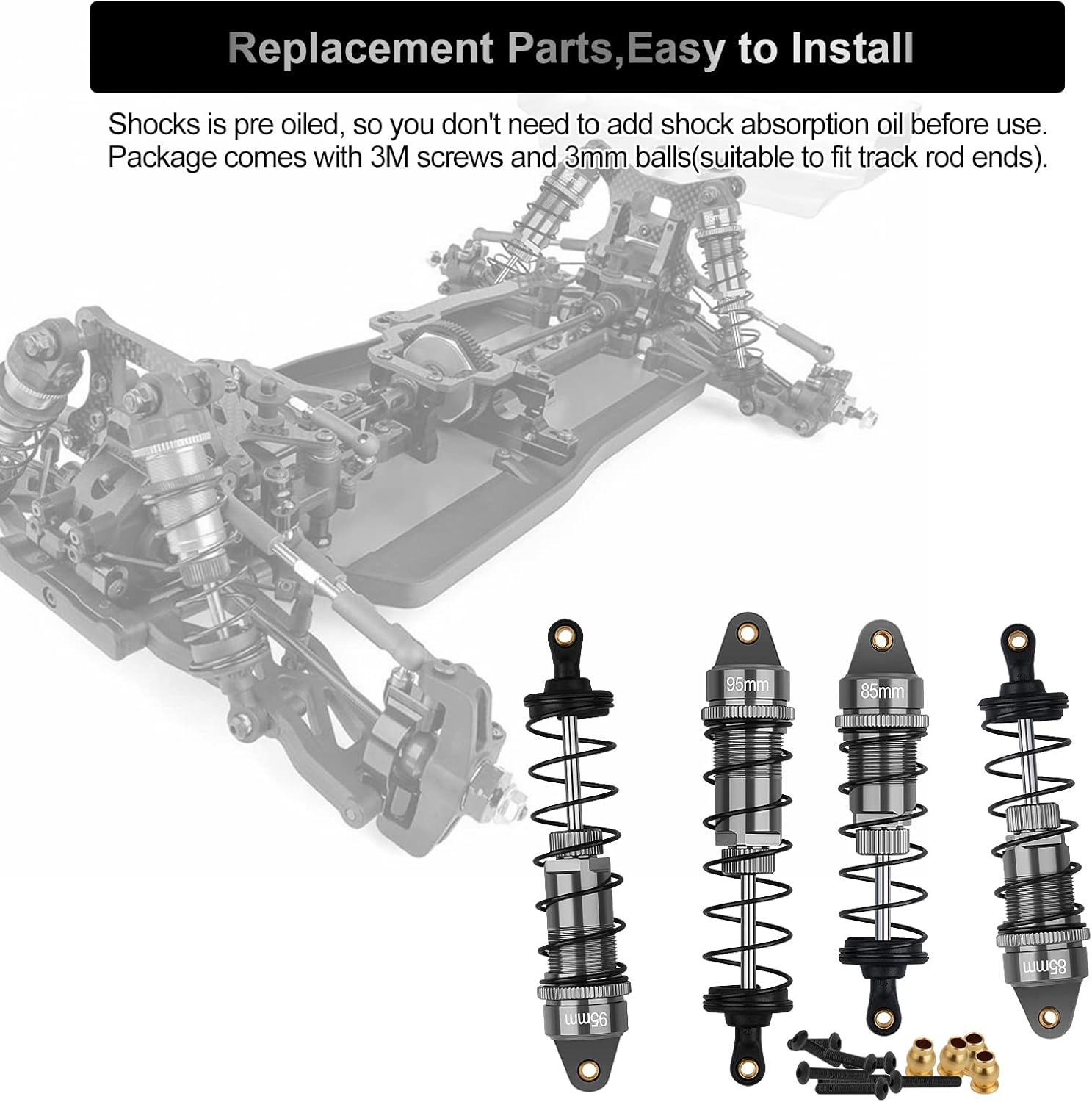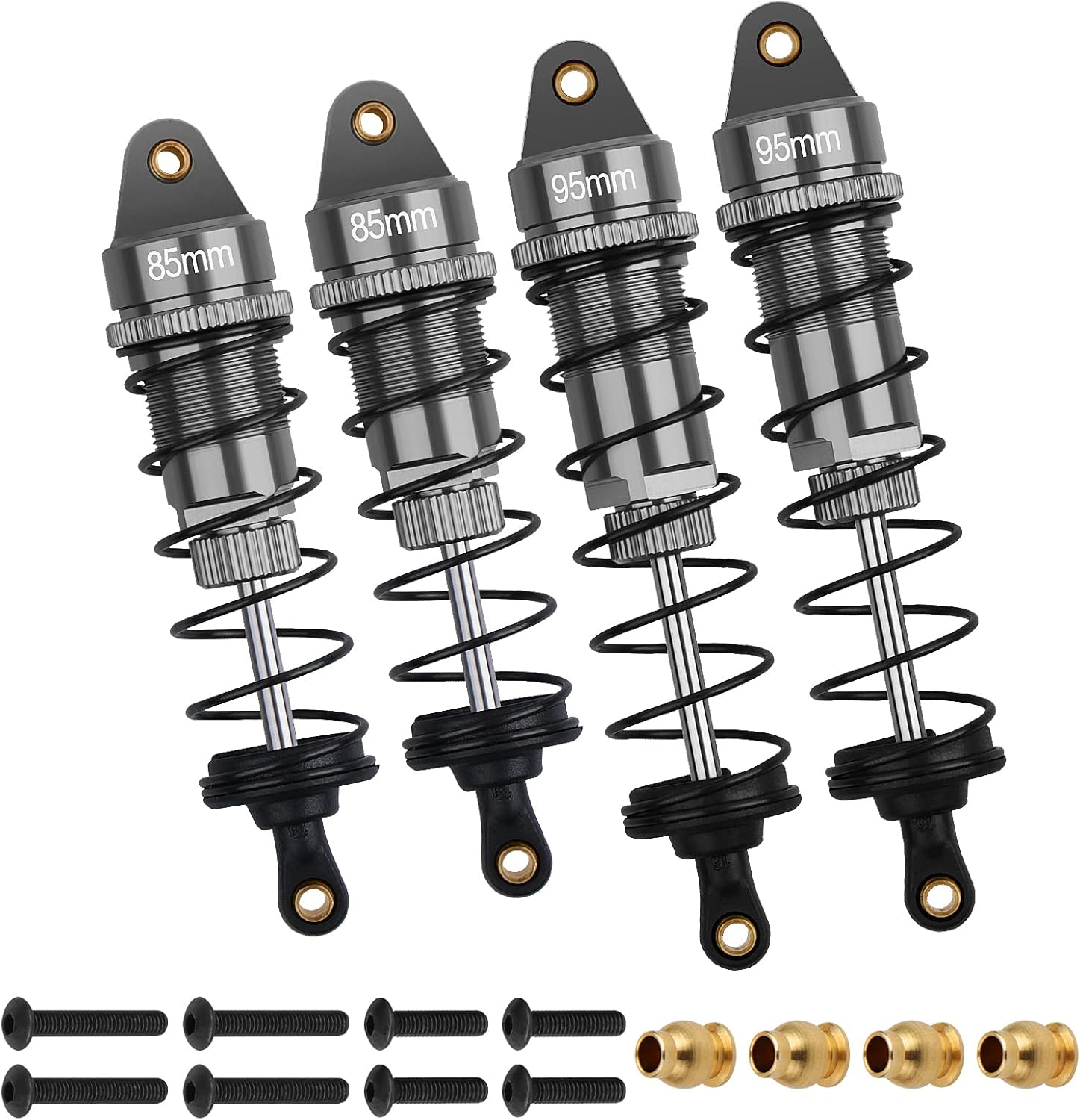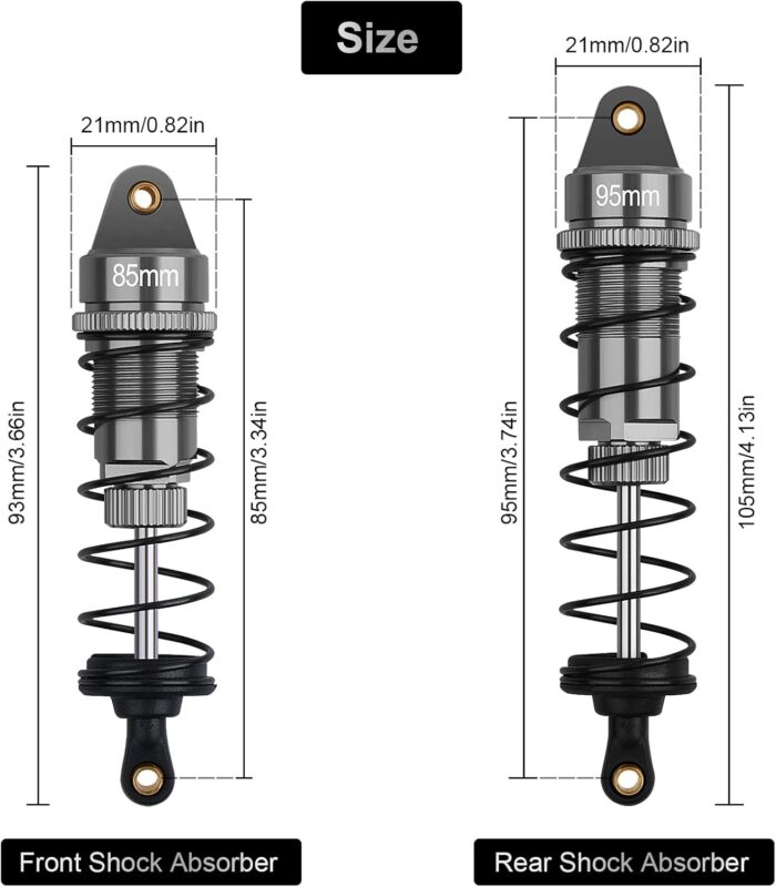 Size: 2x Aluminium Alloy Front Shock Absorber (Total length:approx 93mm/3.66in), 85mm/3.34in eye-to-eye; 2x Aluminium Alloy Rear Shock Absorber (Total length:approx 105mm/4.13in), 95mm/3.74in eye-to-eye