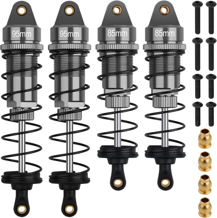 4Pcs RC Shocks Set 1:10 Scale Replacement Parts Fits for 1/10 1/12 WLtoys 104001,124019, Kyosho, Tamiya, Losi RC Buggy/Racing Cars-85mm Front Shocks & 95mm Rear Shocks (Gray)