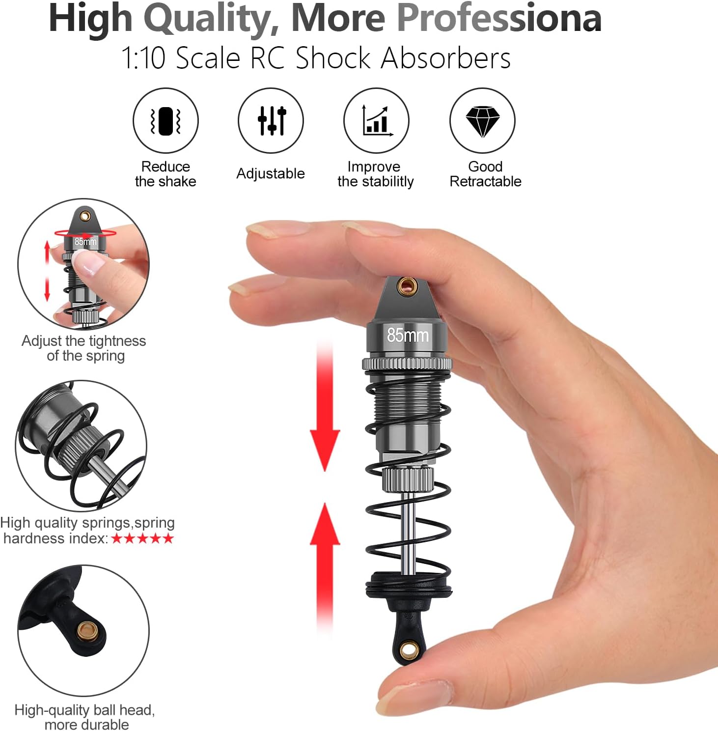 Professional: Replacement parts great for 1:10 scale,1:12 scale rc buggy and Rally cars, equipped with high-quality springs, adjustable, good retractable, professional shock absorption performance, reduce the shake, improve the stability