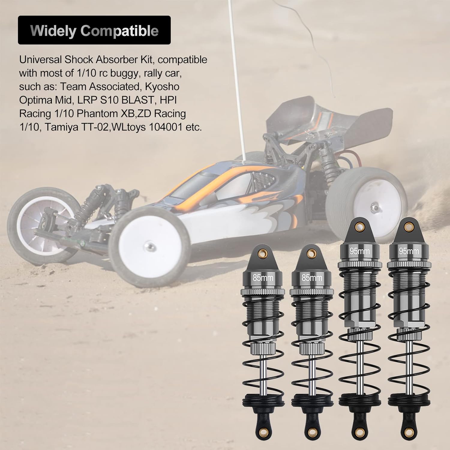 Compatible: RC car shock absorber set, update parts suitable for most of 1:10 1:12 rc buggy and Rally cars,such as WLtoys 124019,Team Associated RC10B74.1,Team Losi Racing 22X-4 Elite,Kyosho Optima Mid and Turbo Optima, Losi TENACITY DB Pro, Tamiya TT-02BR and XV-02 Pro etc. (Notice: this shock absorber is not compatible with traxxas cars)