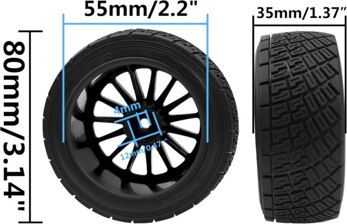 2.Size Info: Tire Outer Diameter: 80mm/3.14″ ; Tire Width: 35mm/1.37″; Rim Inner Diameter :54mm/ 2.12″ ;Wheel Drive Hex: 12mm/0.47″; Axle Hole Diameter: 4mm/0.15″.