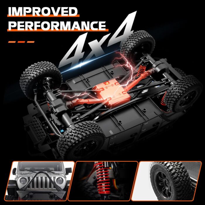 ✅𝗣?𝗘𝗖𝗜𝗦𝗘 𝗖𝗢𝗡𝗧𝗥𝗢𝗟 & 𝗦𝗨𝗣𝗘𝗥𝗜𝗢𝗥 𝗣𝗘𝗥𝗙𝗢𝗥𝗠𝗔𝗡𝗖𝗘 – The proportional throttle and steering system provide smooth acceleration and responsive turning, allowing for precise maneuvering. Featuring a 4×4 drive system, and durable vacuum tires, the MN-128 excels on rocky, grassy, and sandy terrains. Its independent suspension system and high-elastic shock absorbers provide exceptional stability, while the high ground clearance enable impressive climbing ability and obstacle navigation.