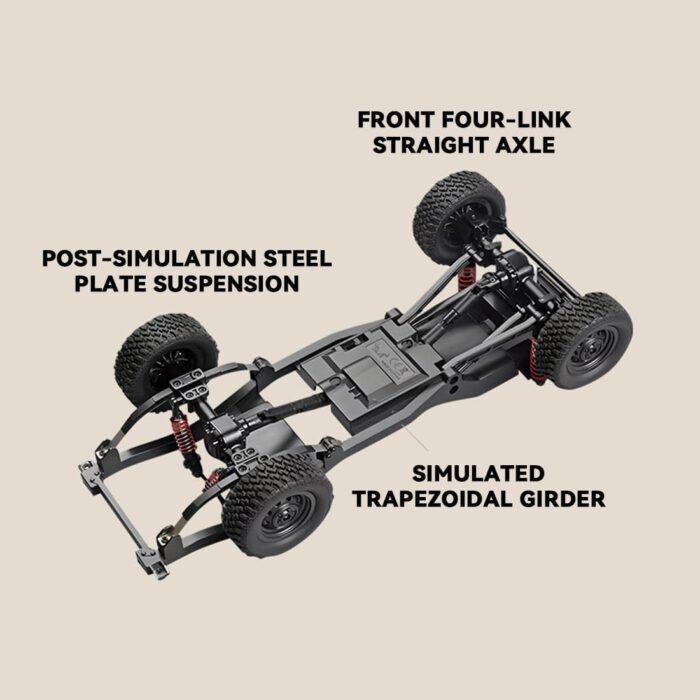 🚚 【Suspension Damping System】The suspension system with leaf springs and a 4-link straight axle, can protect the RC Rock Crawler from vibration caused by rugged roads and make the driving more stable. With 2.4GHz transmitter strength, its strong transmitter power means no signal interference if multiple players race simultaneously.