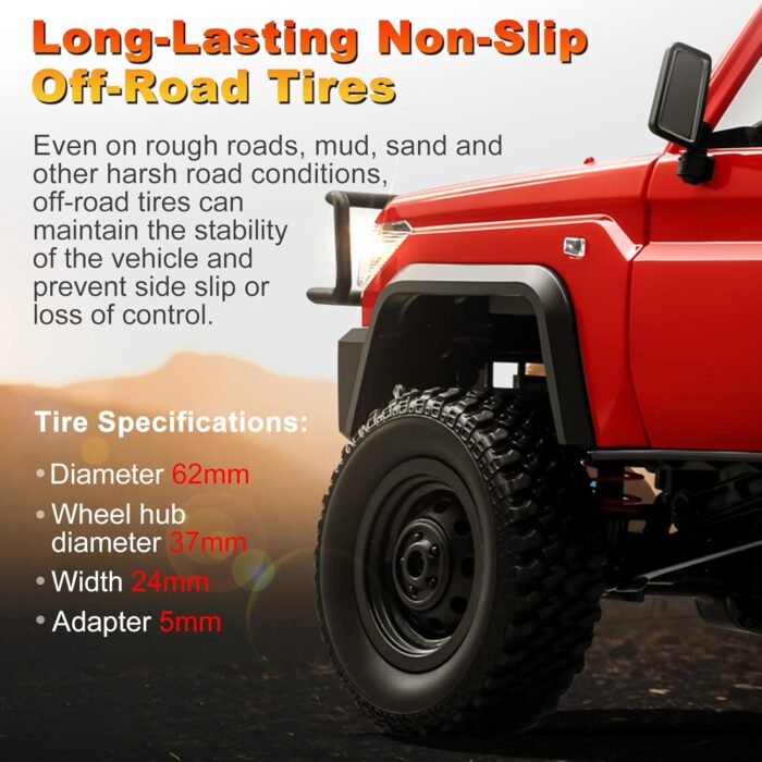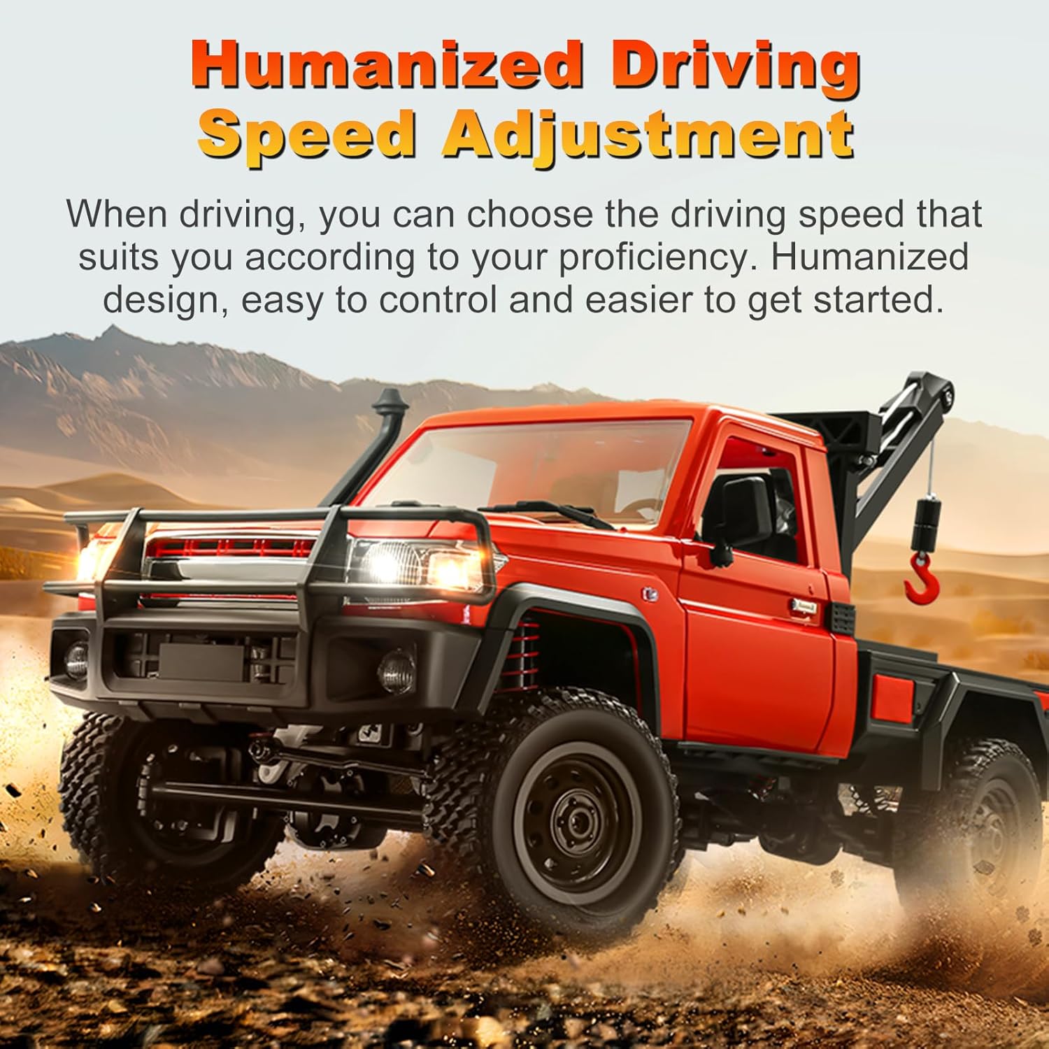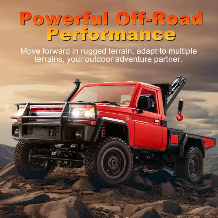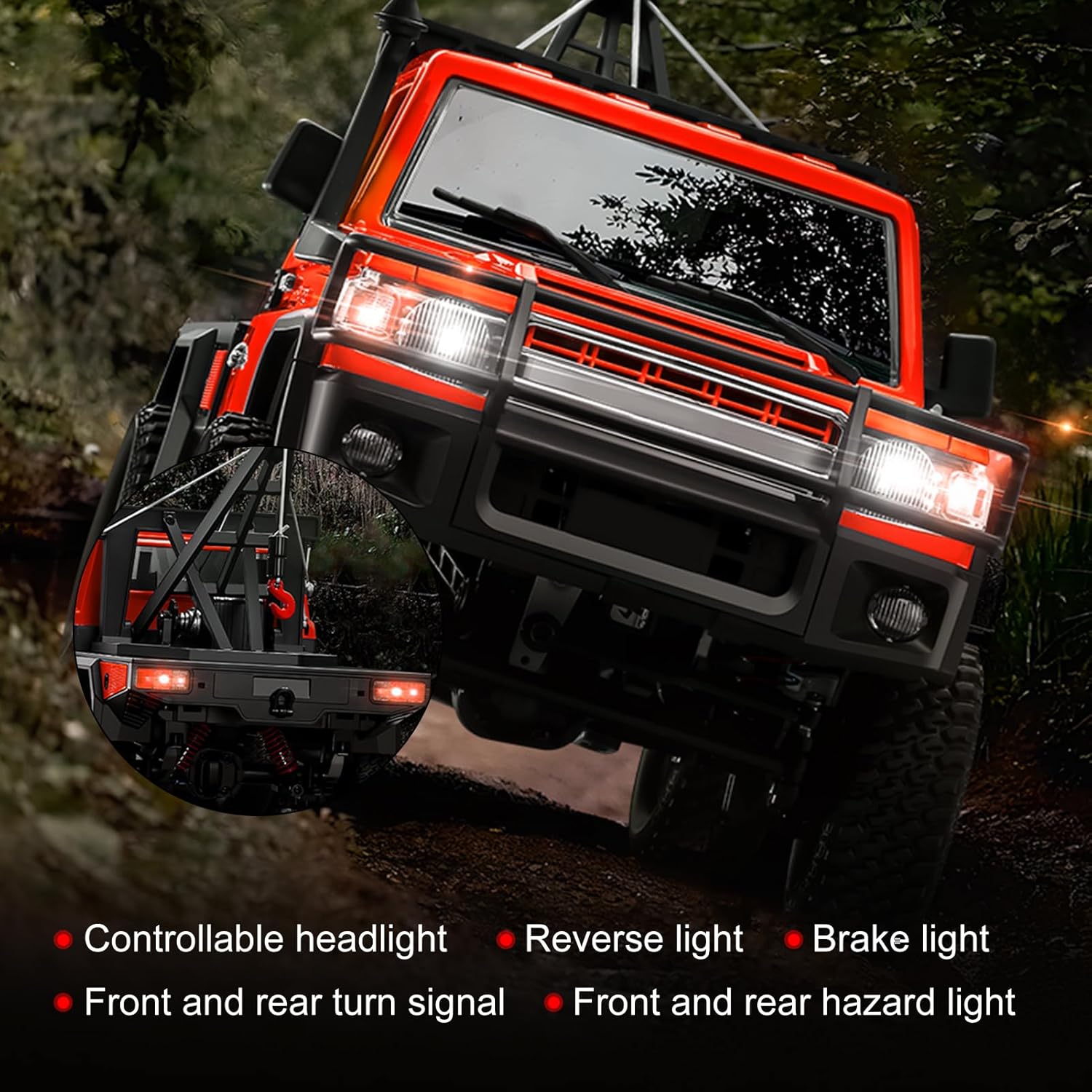 Realistic Design: This remote control crawler car includes controllable headlights, taillights, and a detailed interior, alongside functional doors and a hood, making it a highly realistic and engaging remote control car for Adults.High-Performance Remote Control: This remote control pickup truck is equipped with a powerful 7.4V 1200mAh lithium battery, offering an impressive usage time of 30-40 minutes for uninterrupted off-road adventures.
