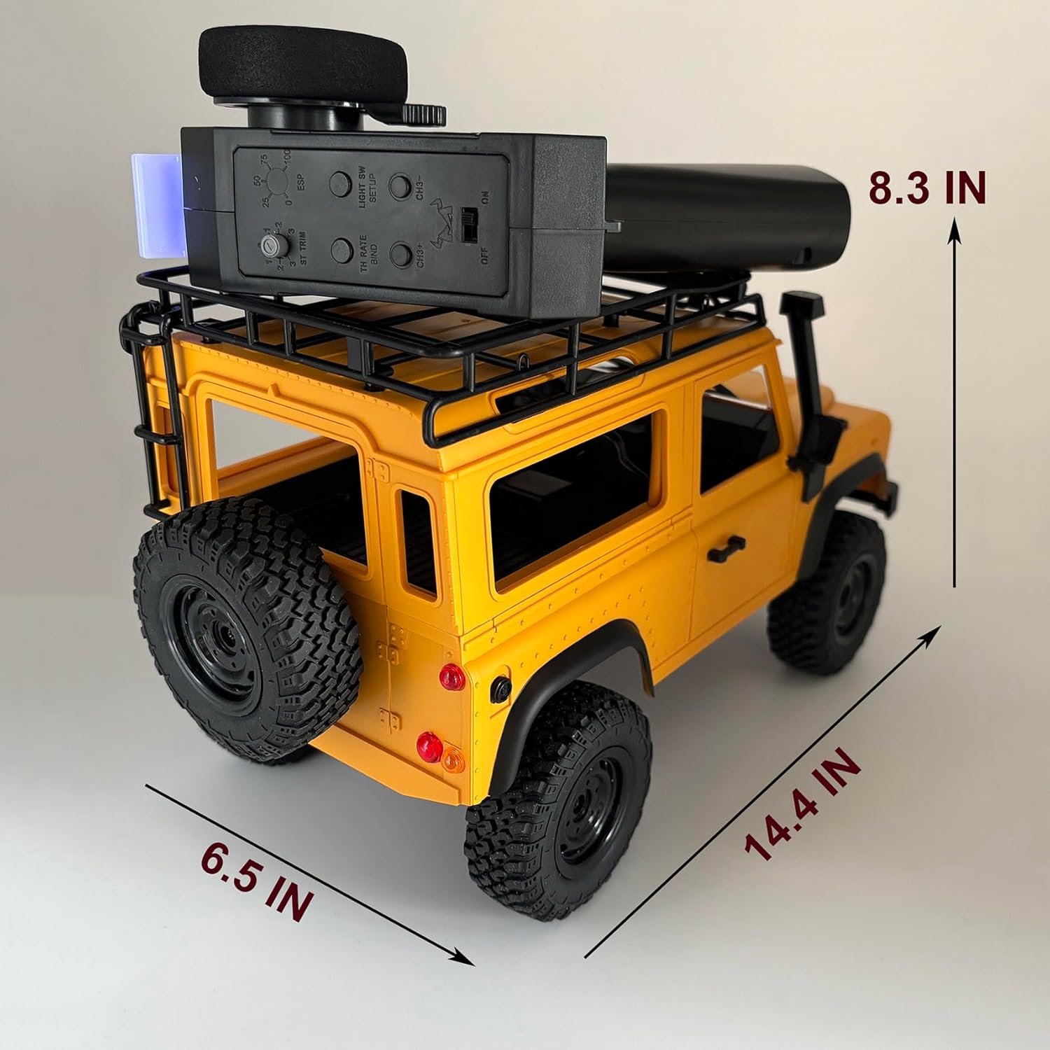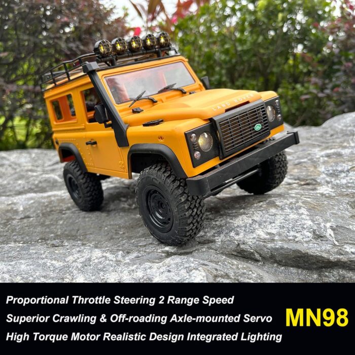 【Realistic Model】MN-98 RC Crawler 1/12 scale, classic model, exquisite interior, it is a highly detailed replica of the Land Rover D90, capturing the iconic design and features of the real vehicle. This includes intricate bodywork, realistic interior details, and functional lights, making it a visually appealing model. With 2.4GHz transmitter strength, there is no signal interference if multiple players race simultaneously.