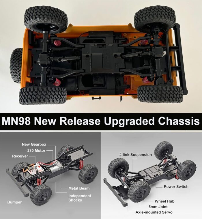 【Decent RC Gift】The MN98 remote control truck offers several improvements in its chassis, suspension, gearbox, motor, servo, and overall off-roading and crawling capabilities. These enhancements make it a durable, reliable, and highly capable RC vehicle for enthusiasts who enjoy realistic and challenging off-road experiences. This hobby RC crawler can be a decent gift for an adult Aged 16+.