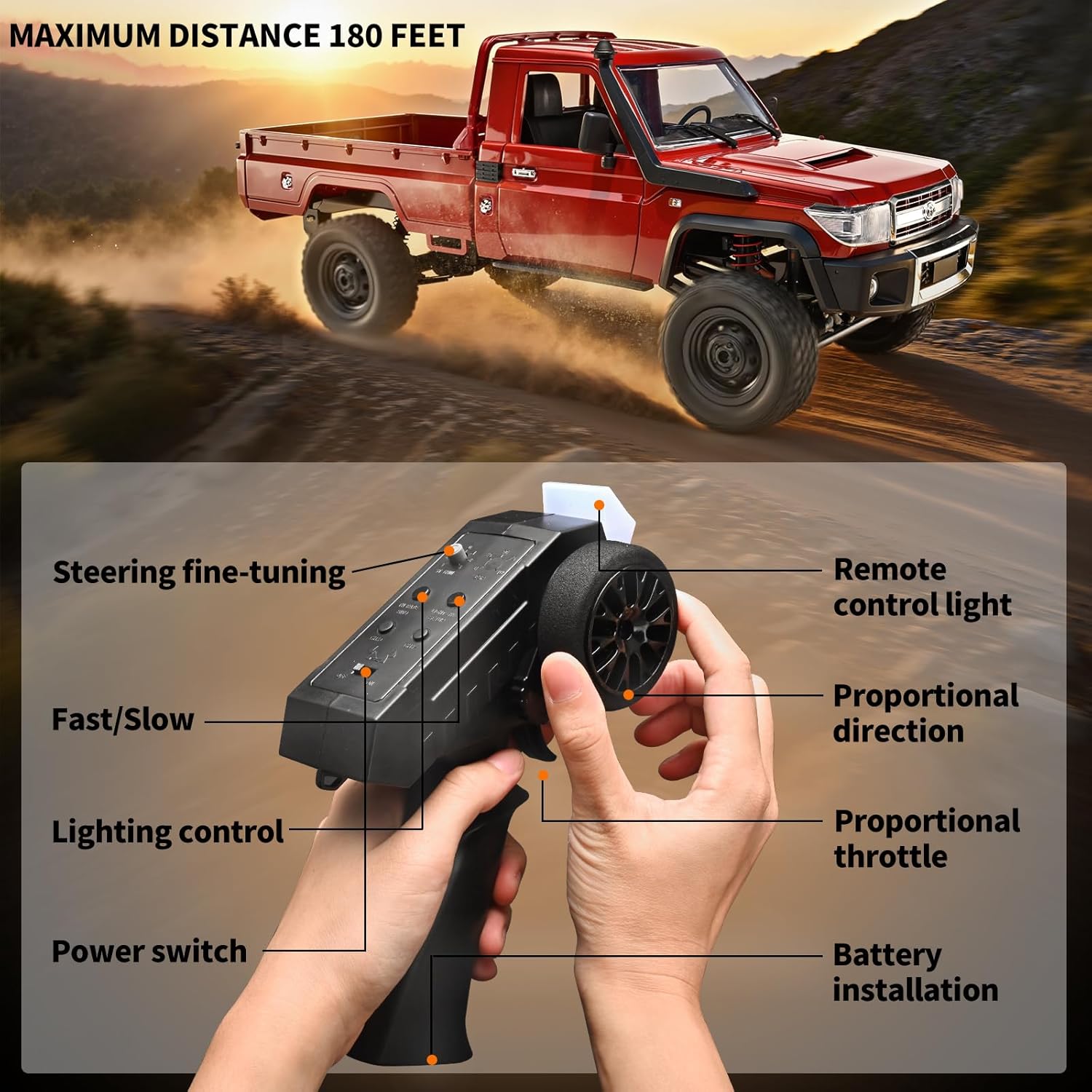 【Conquer All Kinds of Rough and Rugged Terrain】The powerful motor provides a robust 4WD drive power system, enabling this RC pickup truck to adapt to any terrain and driving style. It can be driven on sand, mountains, grass, beaches, muddy areas, and rocky trails, offering a true off-road driving experience that allows you to conquer sharp turns or challenging terrain like a professional driver. Whether you’re a beginner or an experienced RC car enthusiast, you can easily master it.