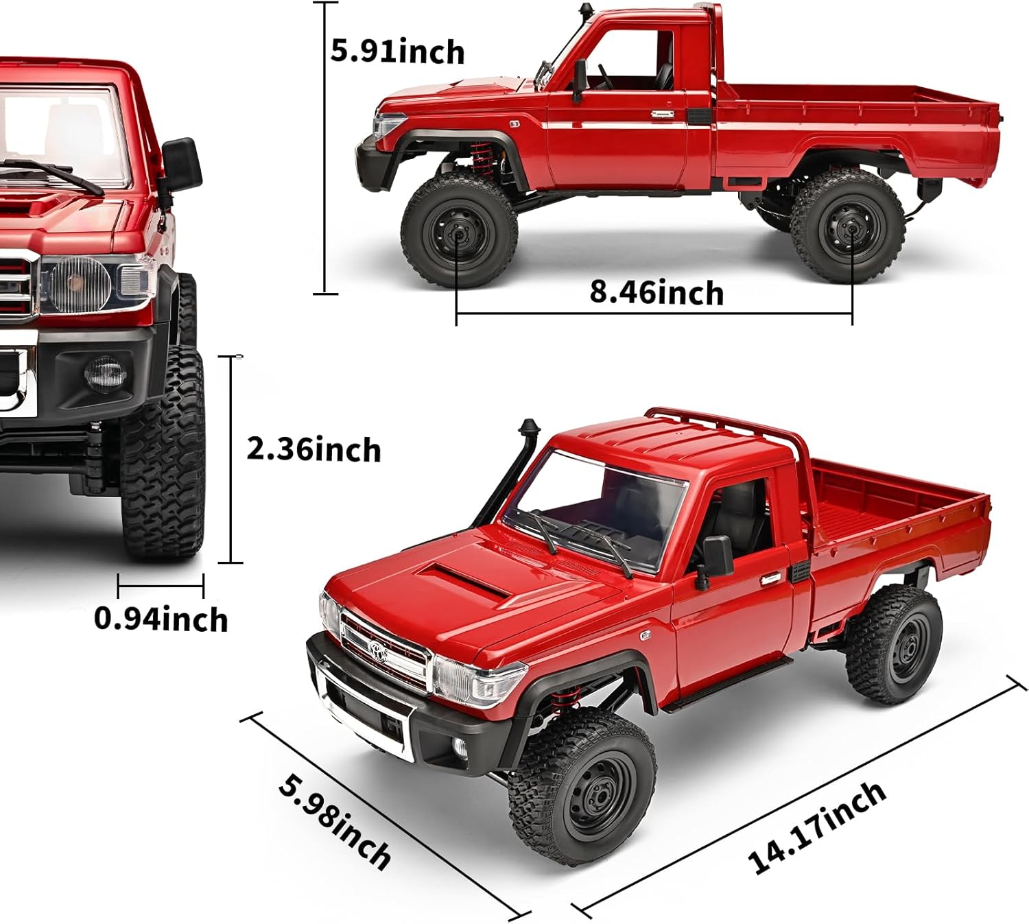【All Terrain RC Rock Crawler 4×4】The 1/12 RC truck MN82 Land Cruiser 79 is a classic, realistic, and detailed off-road RC car. This remote control truck is equipped with a high-torque 280 brushed motor, 17g waterproof servo, and 4WD drive system. With two speed settings and dual throttle control, plus a load capacity of 2 kg, it is sure to give you an unforgettable remote control driving experience.This RC crawler is perfect for RC hobbier,I believe they will be satisfied with this RC car.